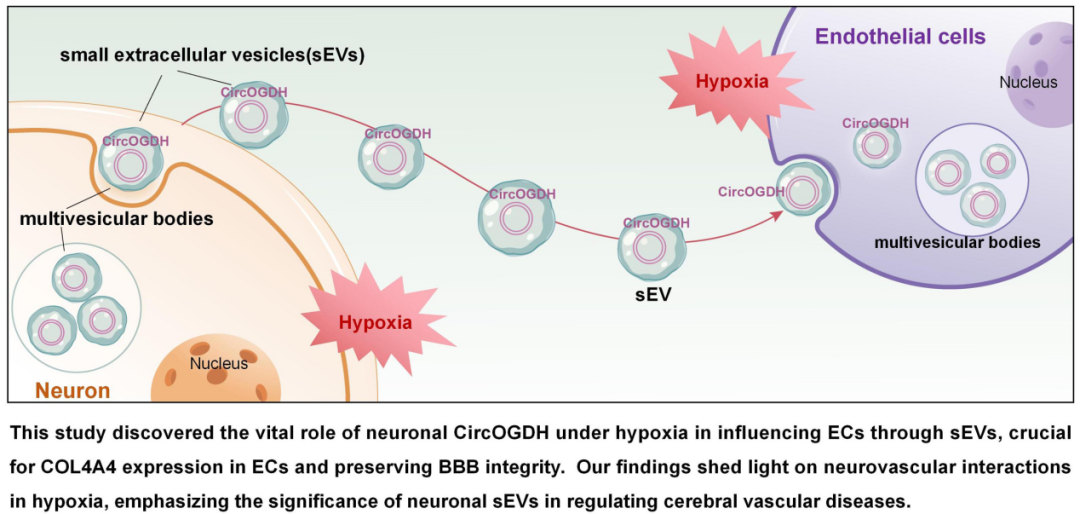 图注:本研究揭示了缺氧状态下神经元通过sEVs传递CircOGDH的关键作用,其通过上调ECs中COL4A4的表达,维持BBB完整性。这一发现阐明了缺氧环境下神经与血管的交互机制,并凸显神经元sEVs在调控脑血管疾病中的核心价值。