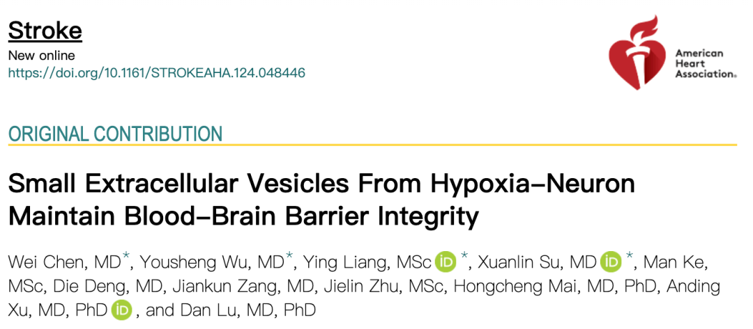 暨南大学附属第一医院徐安定/逯丹教授团队前期报道了缺氧特异性CircOGDH是AIS诊断和缺血半暗带预测的生物标志物,主要表达在缺血半暗带神经元中。在此基础上,2025年4月2日该团队联合中山大学孙逸仙纪念医院麦鸿成副研究员于国际期刊《Stroke》在线发表题目为“Small extracellular vesicles from hypoxia-neuron maintain blood-brain barrier integrity”的研究论文,针对AIS并发出血转化病理机制,探究了急性缺血性卒中后血脑屏障修复的分子机制,通过小规模临床病例对照研究、脑组织样本和动物细胞实验验证,详细阐述了AIS生物标志物 CircOGDH在缺血半暗带神经元中通过小细胞外囊泡(Small Extracellular Vesicles,sEVs)传递至内皮细胞保护BBB并进入循环的分子机制。