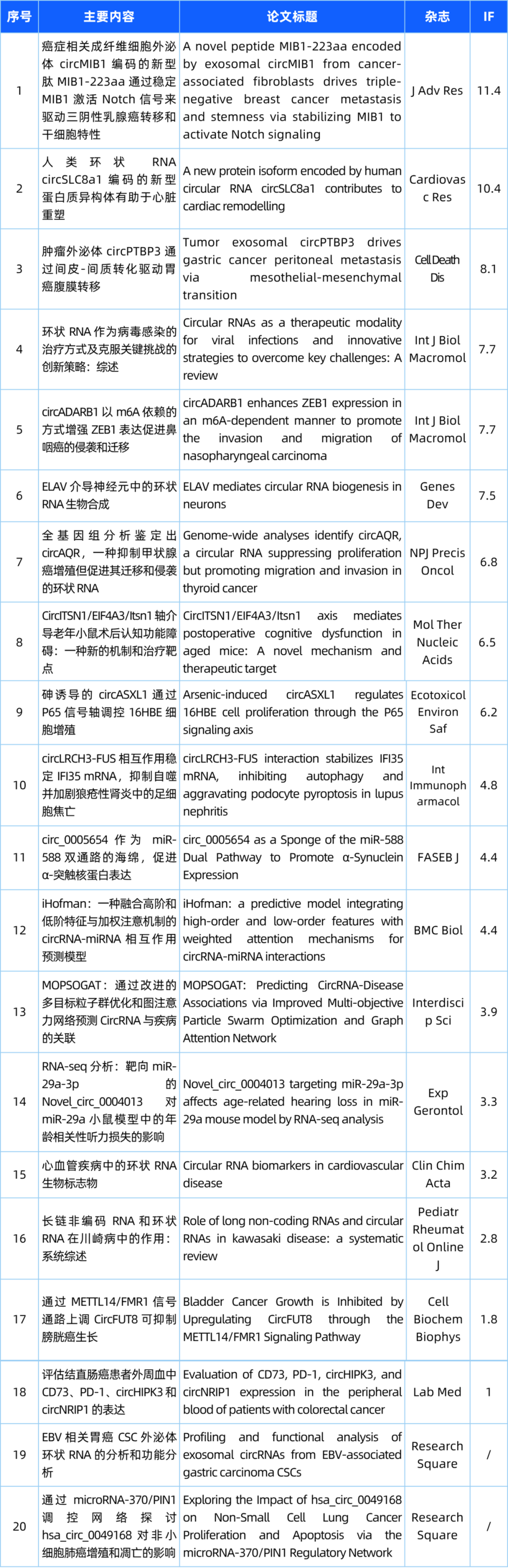 欢迎来到“circRNA研究汇总”栏目,本栏目将为您带来circRNA领域的最新研究成果。本期我们精选了20篇最新文献,涵盖了circRNA的基础研究、功能探究以及与疾病的关联。请您紧跟circRNA研究的步伐,共同洞悉科研前沿的最新动态! 检索式:(circRNA[Title/Abstract]) OR (circular RNA[Title/Abstract]) OR (circular mRNA[Title/Abstract]) 研究汇总列表 分类: 最新重要进展, 每周进展汇总admin六月 16, 2025评论