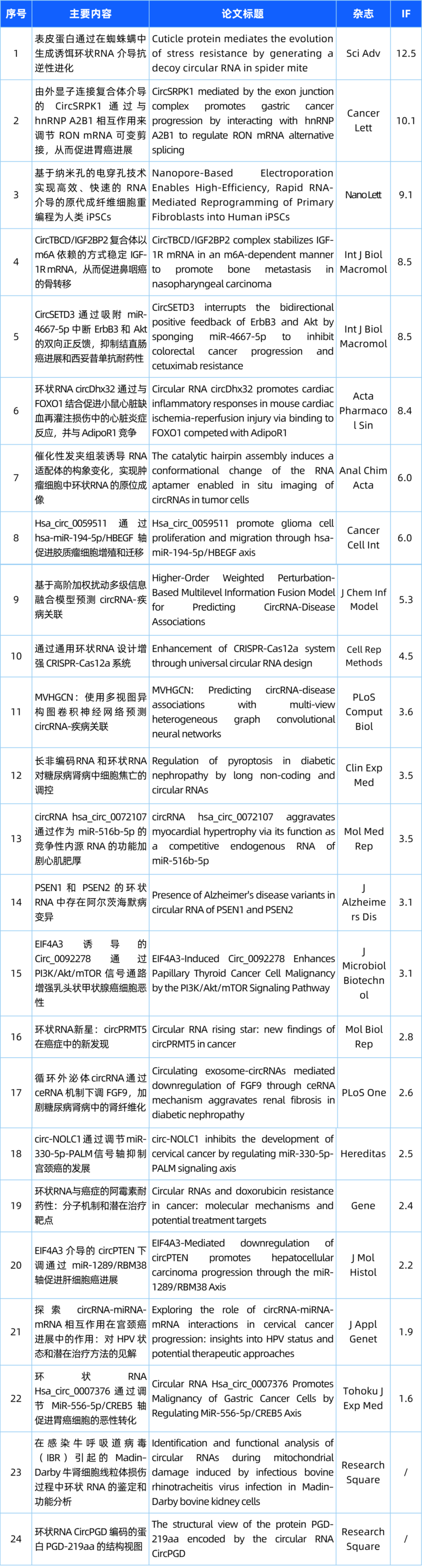 欢迎来到“circRNA研究汇总”栏目,本栏目将为您带来circRNA领域的最新研究成果。本期我们精选了24篇最新文献,涵盖了circRNA的基础研究、功能探究以及与疾病的关联。请您紧跟circRNA研究的步伐,共同洞悉科研前沿的最新动态! 检索式:(circRNA[Title/Abstract]) OR (circular RNA[Title/Abstract]) OR (circular mRNA[Title/Abstract]) 研究汇总列表 分类: 前沿动态, 最新重要进展, 每周进展汇总admin六月 26, 2025评论