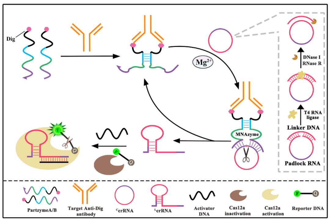 靶标Anti-Dig抗体存在的情况下,Anti-Dig抗体触发完全Mg2+依赖性MNAzyme的组装,并恢复其水解活性,从而允许MNAzyme识别并切割CcrRNA,形成线性的LcrRNA。LcrRNA激活CRISPR/Cas12a系统的反式切割活性,进一步循环切割大量的荧光报告基因单链DNA底物,产生持续放大的荧光信号,从而实现Anti-Dig的超敏检测。
