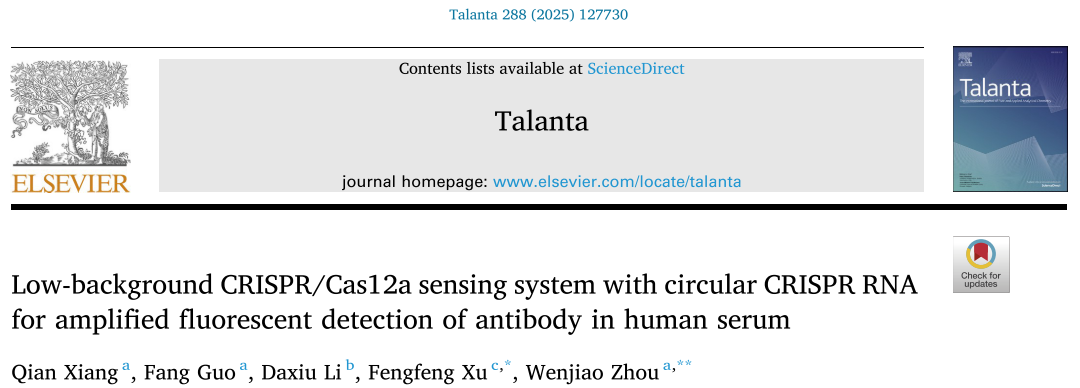 近日,重庆理工大学Fengfeng Xu和Wenjiao Zhou团队在Talanta期刊上发表了研究论文:Low-background CRISPR/Cas12a sensing system with circular CRISPR RNA for amplified fluorescent detection of antibody in human serum。研究构建了一种环状crRNA(CcrRNA)介导的新型低背景CRISPR/Cas12a传感系统,用于人血清中Anti-Dig抗体荧光信号放大检测。该系统可发展成为一种简单、灵敏、可靠的生物传感方法,并展现应用于临床诊断和生物医学研究的巨大潜力。