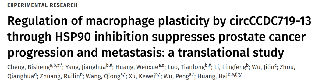 近日,中山大学孙逸仙纪念医院黄海/许可慰团队,南方医科大学南方医院程必盛/王琼/吴芃团队合作在Int J Surg发表研究论文:Regulation of Macrophage Plasticity by CircCCDC719-13 through HSP90 Inhibition Suppresses Prostate Cancer Progression and Metastasis,首次发现环状RNA circCCDC719-13可通过靶向HSP90诱导铁死亡,重塑肿瘤相关巨噬细胞(TAM)极化状态,从而抑制前列腺癌进展与转移。该研究为环状RNA调控免疫微环境提供了新机制,也为前列腺癌治疗策略提供了潜在靶点。