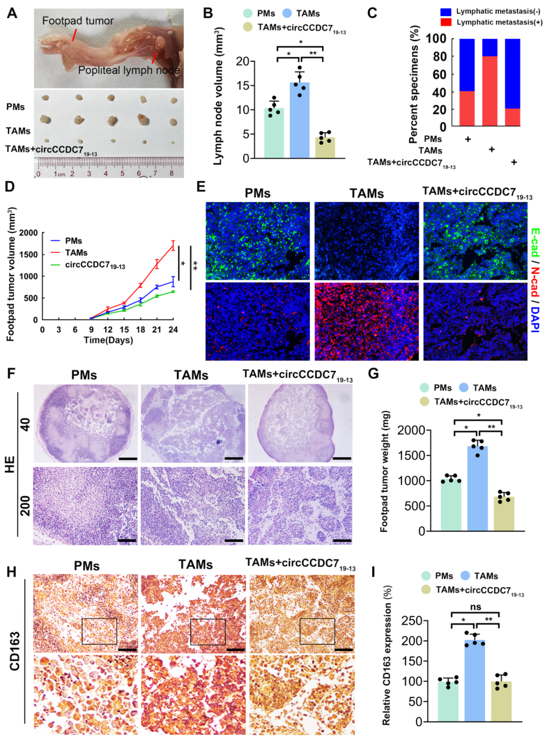 在小鼠足垫联合注射模型中,研究构建TAMs与PCa细胞共注射系统。结果显示,circCCDC719-13过表达显著抑制足垫肿瘤生长与腘窝淋巴结转移。肿瘤组织中E-cadherin表达上调,N-cadherin表达下降,提示EMT过程被抑制。同时,免疫组化发现M2型巨噬细胞(CD163⁺)浸润减少,表明circCCDC719-13可重塑肿瘤免疫微环境。
