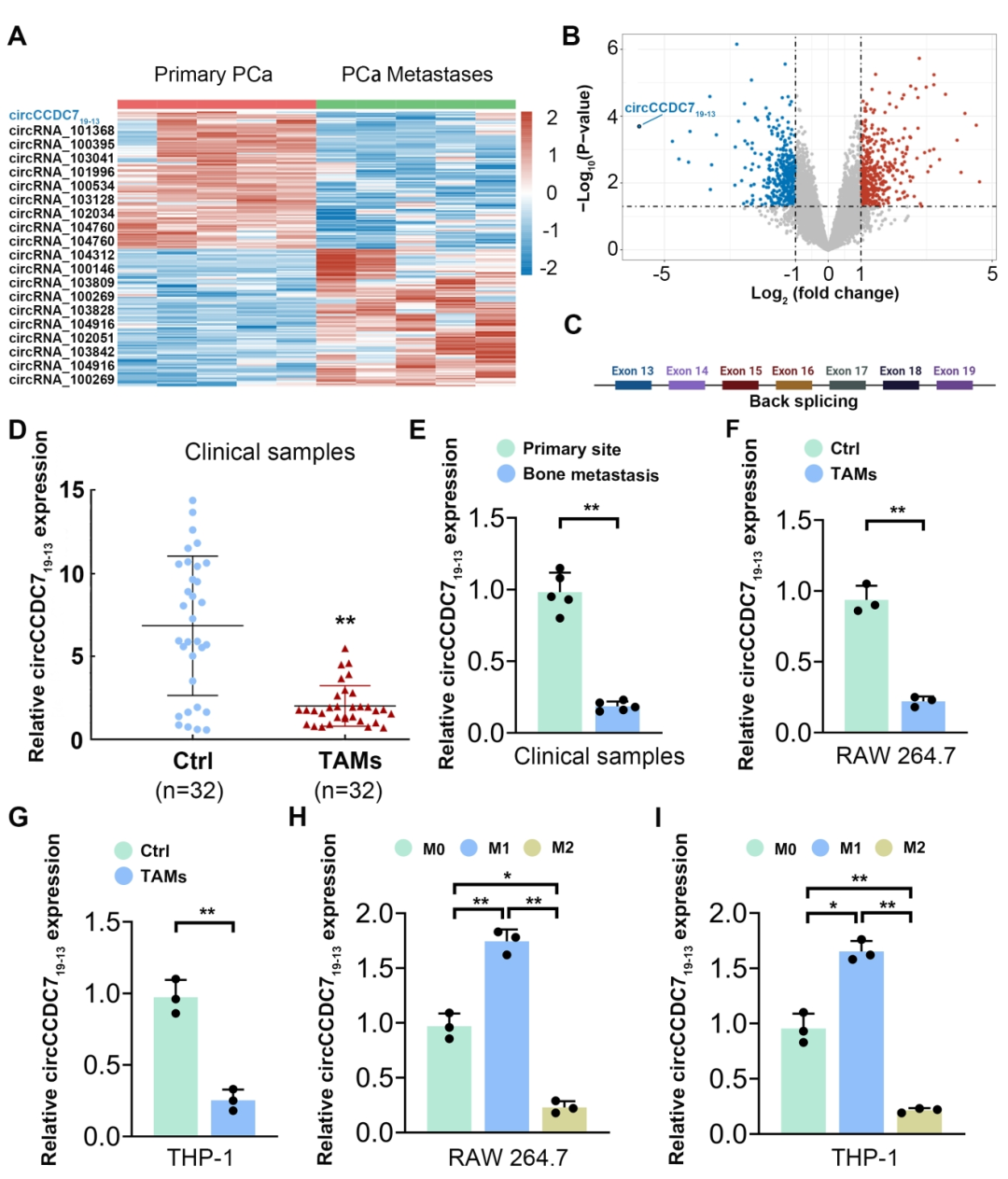 研究通过对原发与骨转移前列腺癌组织来源巨噬细胞的转录组测序,筛选出一系列差异表达的circRNA,其中circCCDC719-13在TAMs中表达显著下调。qPCR验证结果显示,无论是从组织分离的TAMs还是体外诱导的M2型巨噬细胞中,circCCDC719-13均处于低表达状态,提示其可能在TAM表型维持和免疫微环境构建中发挥作用。