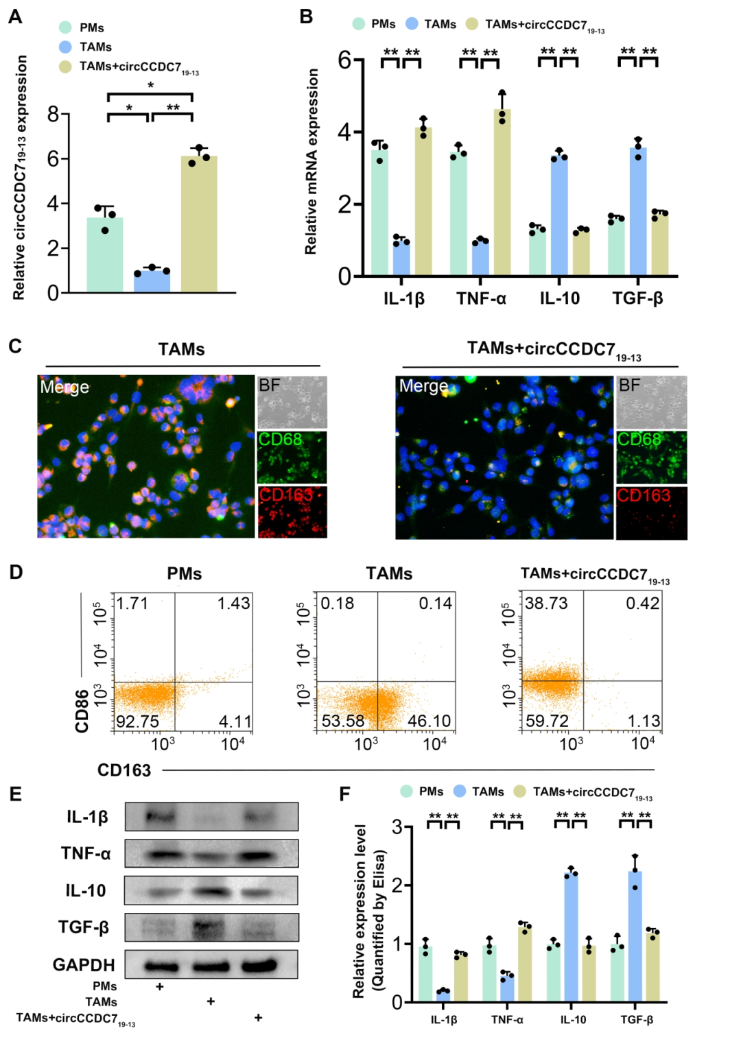 为明确circCCDC719-13在TAM中的功能,研究使用慢病毒系统对TAMs进行circCCDC719-13过表达干预。结果表明,该操作显著降低M2表型标志物CD163表达,同时上调M1表型CD86,并增强TNF-α和IL-1β的表达与分泌。功能实验发现,circCCDC719-13过表达后的TAMs显著削弱了PC3M前列腺癌细胞的侵袭、迁移能力,并抑制其上皮-间质转化(EMT)过程。