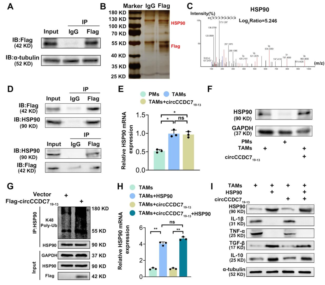 进一步通过免疫共沉淀与质谱筛选,研究识别出HSP90为circCCDC719-13的直接结合蛋白。circCCDC719-13上调可显著降低HSP90蛋白稳定性,增强其泛素化水平。HSP90作为铁稳态与免疫应答调节因子,其表达受抑后,TAM铁死亡敏感性增加,表型由M2向M1转变。反之,HSP90过表达可部分抵消circCCDC719-13的功能,恢复M2状态并增强肿瘤促进作用。