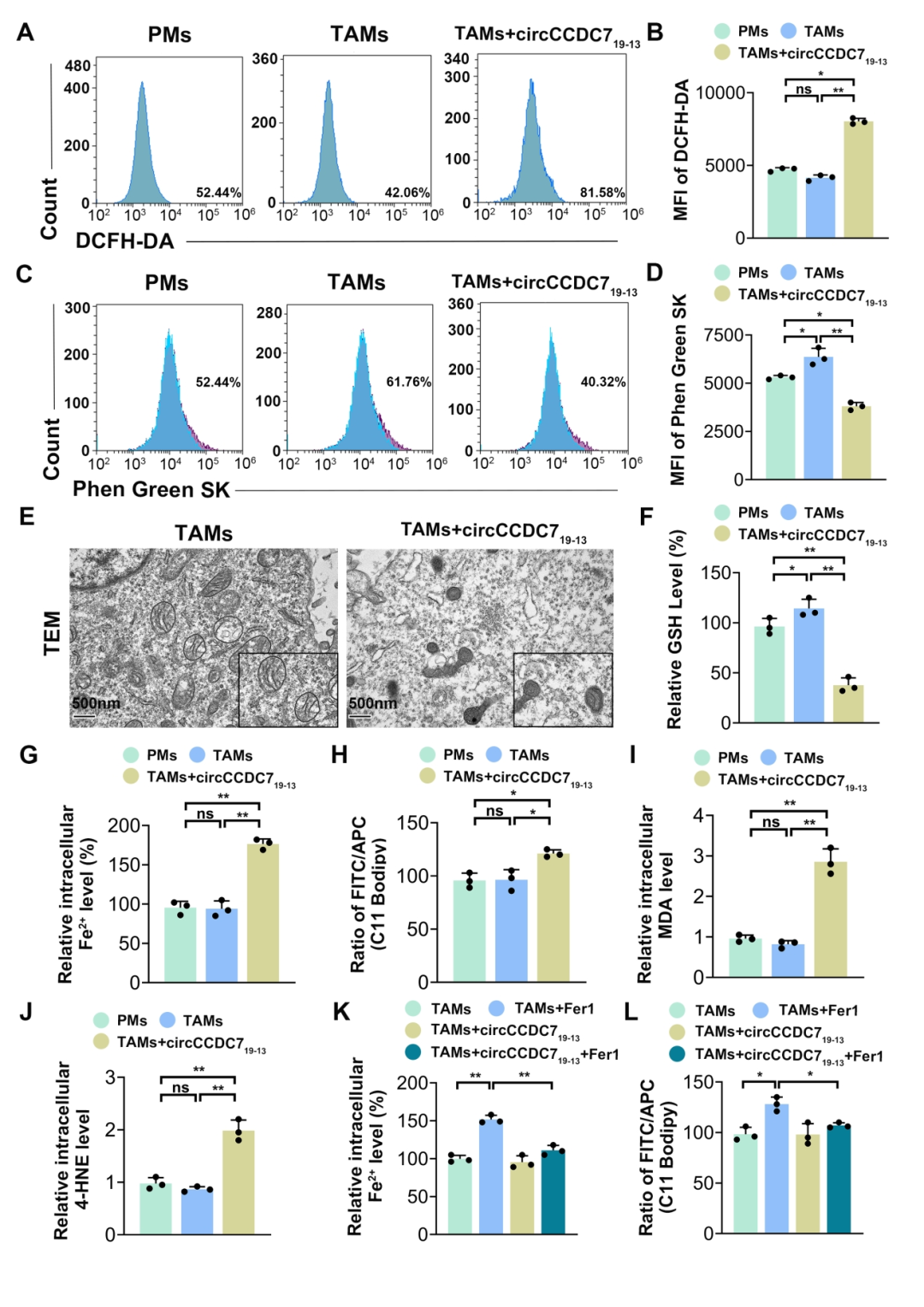 机制研究发现,circCCDC719-13可诱导TAMs发生典型的铁死亡(ferroptosis)表型,包括脂质过氧化物、Fe²⁺和ROS水平升高,谷胱甘肽(GSH)减少,线粒体Cristae消失等。使用铁死亡抑制剂Ferrostatin-1可部分逆转该效应,提示circCCDC719-13通过调控铁死亡影响TAM命运决定。