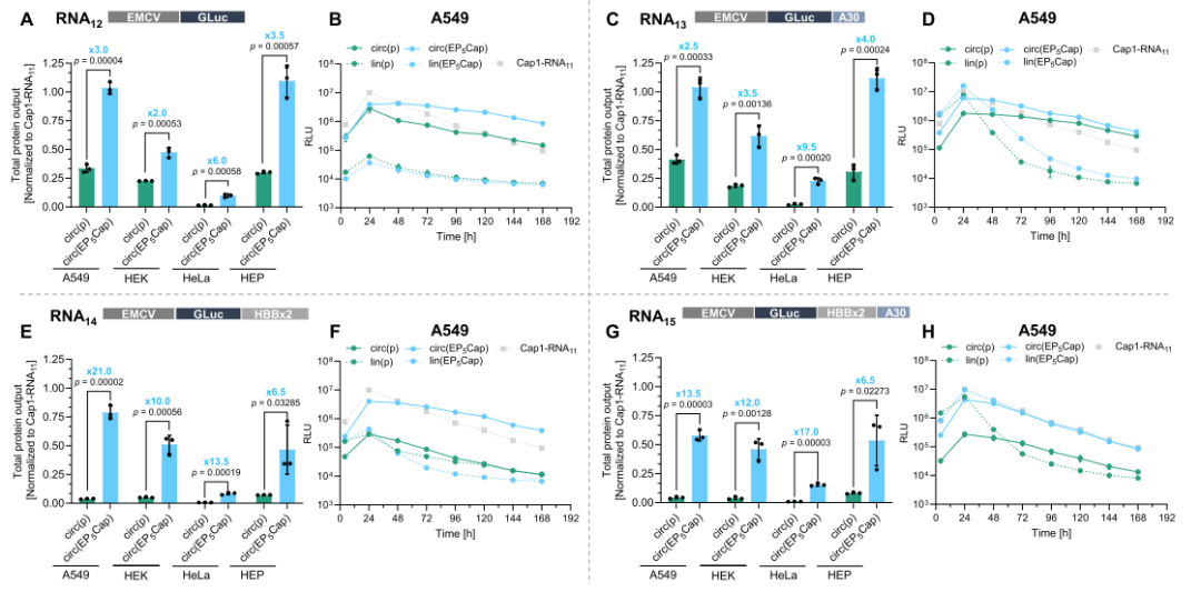 研究还制备了编码人促红细胞生成素(hEPO)的chem-circRNA,LNP包封后并注射到C57BL/6小鼠中,chem-circRNA的总蛋白质表达水平显著高于其线性对应物,证实了化学环化形成的核苷酸间连接的生物相容性。但总体蛋白质输出和翻译持久性相对较低,需要进一步优化chem-circRNA序列。