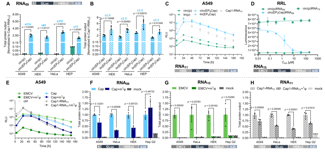 该策略基于经济实惠、容易获得的非侵入性试剂,可以应用于不同长度(长达4000nt)和序列的RNA。其产生的circRNA在细胞中进行相对稳定性和高活性的翻译。该环化方法还兼容化学修饰,如N7-甲基鸟苷帽和m1Ψ,有利于治疗性circRNA的进一步设计和优化。