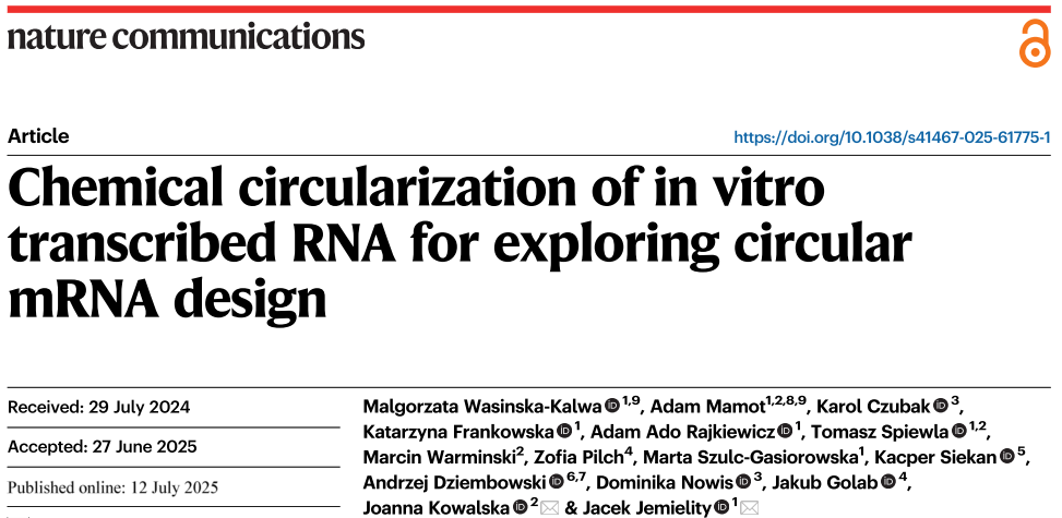 近日,波兰华沙大学 Jacek Jemielity、Joanna Kowalska团队在Nat Commun上发表论文:Chemical circularization of in vitro transcribed RNA for exploring circular mRNA design。研究开发一种新的化学环化策略,可以环化不同长度(35- 4000 nt)的体外转录RNA,最大限度减少环化和功能化RNA所需的步骤。该方法环化效率高达60%,适用于各种序列并兼容RNA修饰,允许设计和合成帽依赖翻译的circRNA。研究合成的编码chem-circRNA体现卓越的蛋白表达能力和良好的生物相容性,可以用于获得治疗性的circRNA。