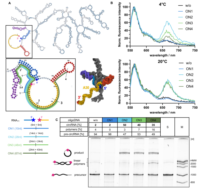 图3 可使用DNA夹板增强挑战性RNA序列的环化效率,并通过应用FRET探针和分子建模优化。