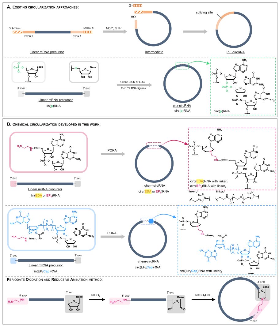 研究基于PORA(高碘酸盐氧化和还原胺化)的直接和选择性化学反应,开发了化学环化RNA方法,以获得chem-circRNA。该反应的起始材料是在携带乙二胺(EDA)基序的转录引物存在下通过标准体外转录获得的RNA。PORA仅需简单试剂的一锅两步反应,不到2小时。