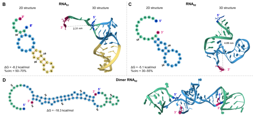 图2 RNA01(B)、RNA02(C)和RNA02二聚体(D)的最小自由能(MFE)二级结构(2D)模型(使用RNAfold网络服务器预测)和预测模型(RNA Composer网络服务器)的三级结构(3D)。