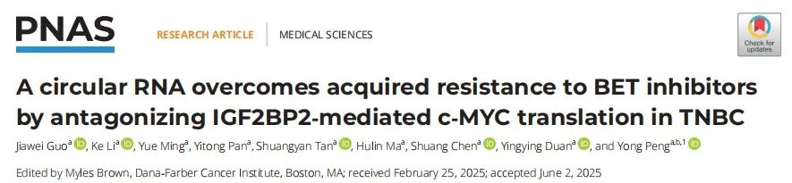 2025年7月1日,彭勇团队在PNAS杂志在线发表了题为A circular RNA overcomes acquired resistance to BET inhibitors by antagonizing IGF2BP2-mediated c-MYC translation in TNBC的研究论文。