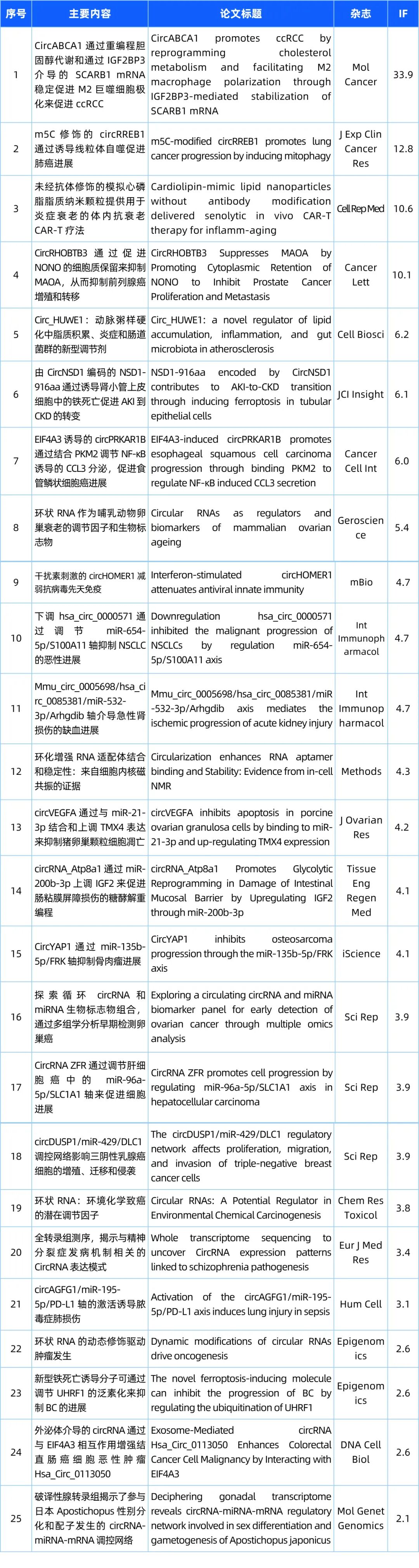 欢迎来到“circRNA研究汇总”栏目,本栏目将为您带来circRNA领域的最新研究成果。本期我们精选了25篇最新文献,涵盖了circRNA的基础研究、功能探究以及与疾病的关联。请您紧跟circRNA研究的步伐,共同洞悉科研前沿的最新动态!