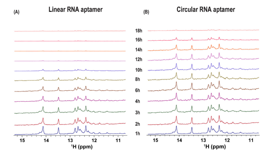 图4 HeLa细胞裂解物中RNA稳定性的基于NMR的监测线性(A)和环状(B)Tat RNA适配体在不同时间点的1D亚氨基质子NMR光谱。