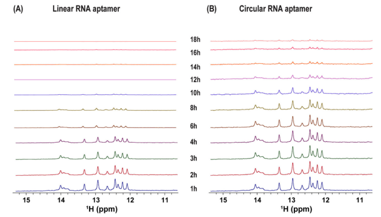 为模拟生物环境,研究在HeLa细胞裂解物中孵育了两种RNA适配体,并使用1D NMR在多个时间点跟踪了其稳定性。在8小时内,环状RNA适配体保持稳定并持续可检测;而线性RNA适配体明显降解更快,其信号在4-6小时几乎消失。这些表明环状RNA适配体即使在富含核酸酶的条件下也能保持其结构。