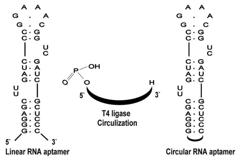 图1 Tat的RNA适配体(34-nt)及使用T4 RNA连接酶环化的RNA。
