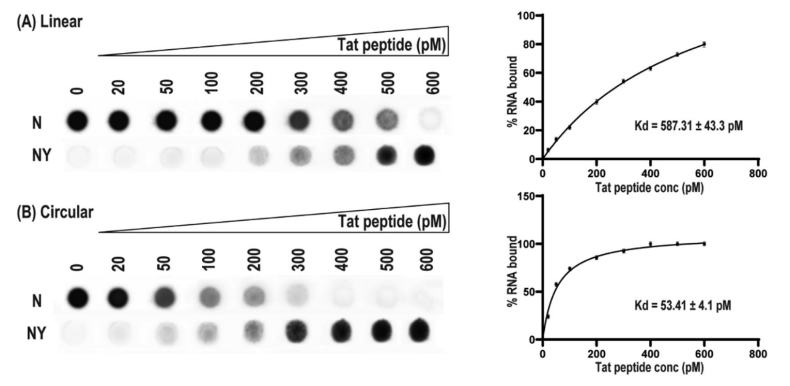 Dot Blot结果显示,circRNA适配体(Kd 53.4 pM)与Tat肽(富含精氨酸基序)的结合亲和力比其线性对应物(Kd 587.3 pM)高约10倍。这可能是由于环状RNA适配体构象灵活性降低,从而能维持更有利的、预组织的结合构象。
