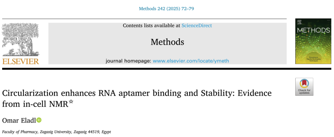 2025年7月16日,埃及扎加齐克大学Omar Eladl团队在Methods上发表研究论文:Circularization enhances RNA aptamer binding and Stability: Evidence from in-cell NMR。研究通过体外环化靶向结合HIV-1 Tat蛋白的RNA适配体,形成环状RNA适配体,并使用细胞内NMR验证了环状RNA适配体增强的Tat结合亲和力和细胞内稳定性,是改善RNA适配体功能的可行策略。