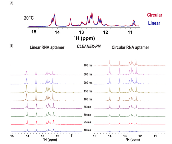 图3 (A)20℃下线性(蓝色)和环状(红色)Tat RNA适配体的体外1D亚氨基质子NMR光谱。(B)在各种混合时间(10-400 ms)记录线性和环状Tat RNA适配体的CLEANEX-PM NMR光谱,以评估质子交换动力学。