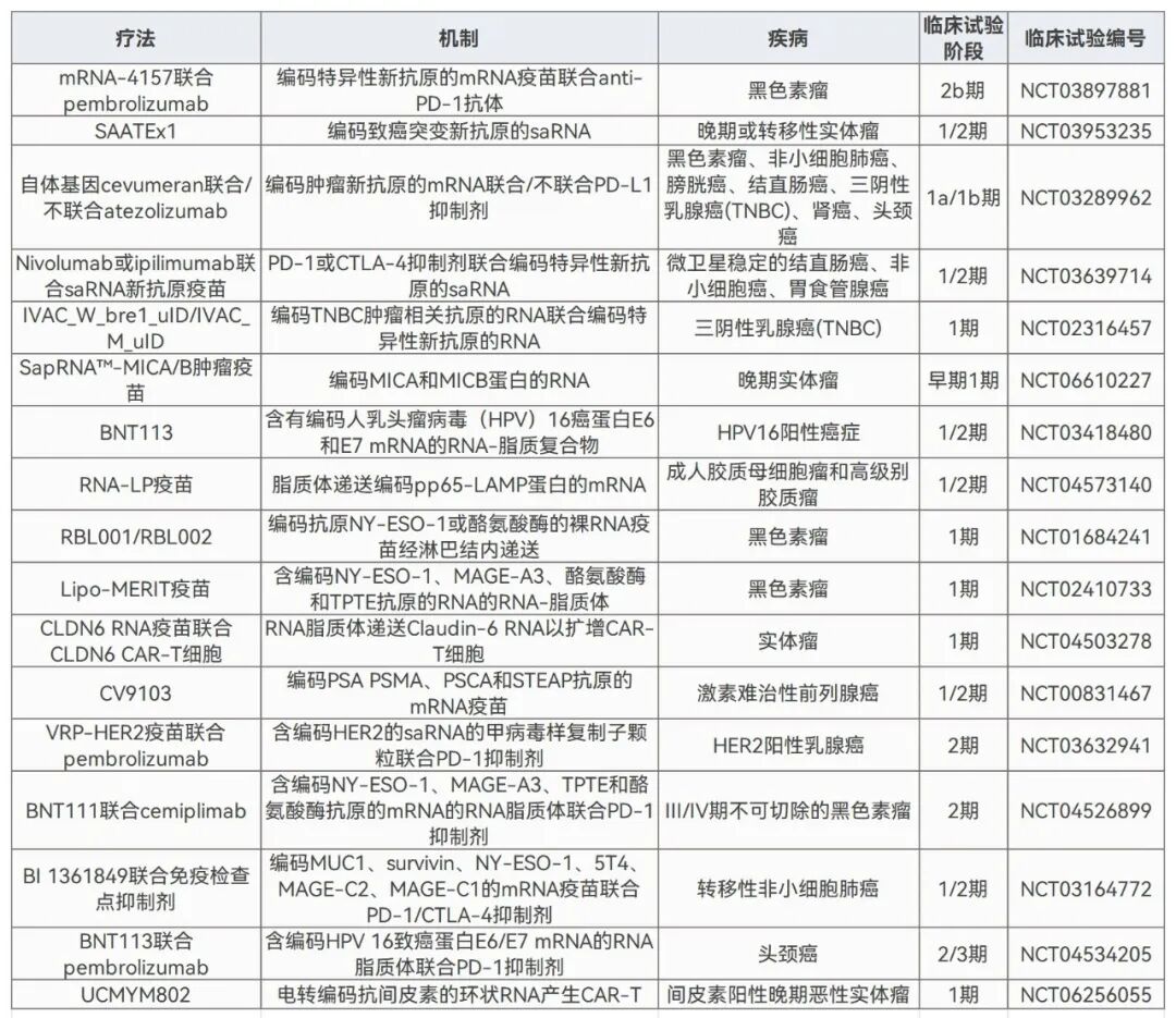 表1 进入临床研发阶段的癌症RNA免疫疗法(部分)