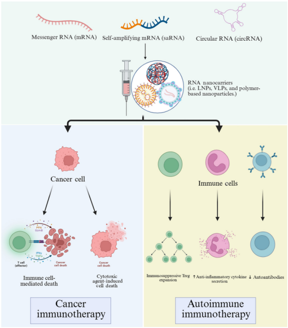 基于RNA的平台利用编码蛋白质的RNA通过纳米载体(如LNPs、VLPs或聚合纳米颗粒)递送,在免疫治疗中具有巨大的潜力,既可提高抗癌活性,又可诱导自身免疫性疾病的耐受性。