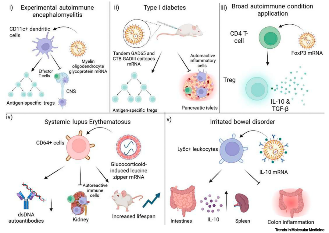 在1型糖尿病中,肌肉内注射编码GAD65和CTB-GADIII的mRNA疫苗可诱导Cy-NOD模型中的抗原特异性Tregs的扩增,并改善了糖耐量,减少了胰岛的免疫细胞浸润和相关炎症[14]。