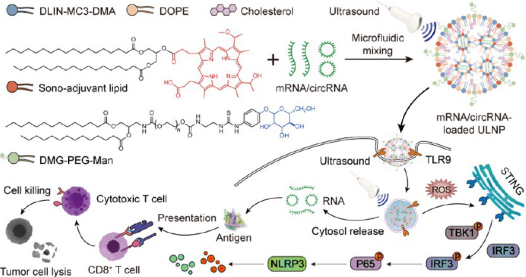 研究开发了一种掺入声佐剂的LNP(ULNP),可通过超声激活增强mRNA和环状RNA(circRNA)在淋巴结(LN)的特异性递送,并促进先天免疫途径激活。ULNP+US递送circRNA,可诱导有效的抗肿瘤T细胞免疫,完全消除小鼠的原位肝肿瘤。US+ULNP策略为先天免疫刺激和癌症治疗的mRNA和circRNA疫苗提供一个时空可控的强大的递送平台。
