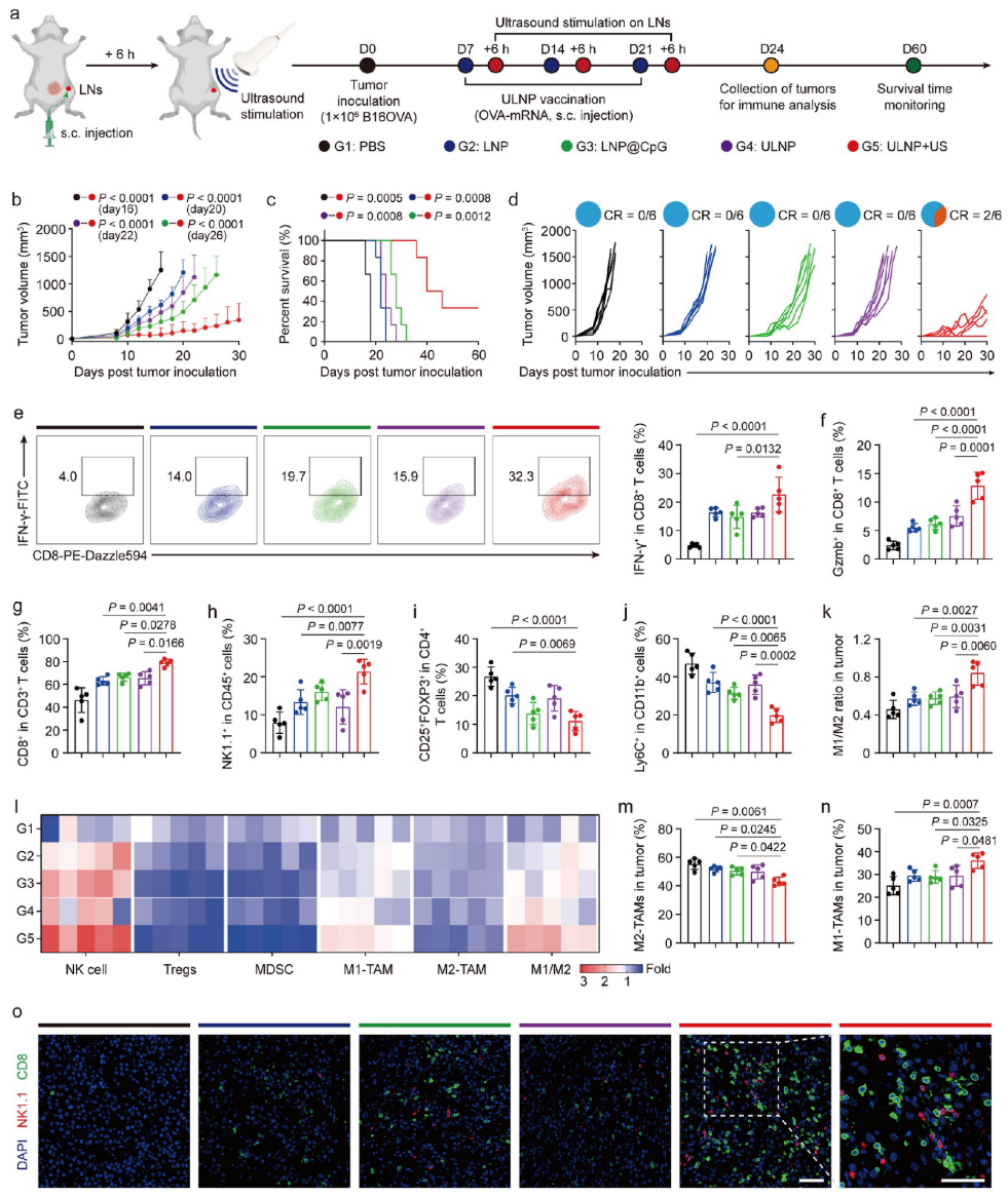 在小鼠体内,相比传统的整合Toll样受体佐剂的LNP(LNP@CpG),负载OVA-mRNA的ULNP联合局部超声刺激(ULNP + US),促进了mRNA的LN特异性递送,诱导高于LNP@CpG组2.5倍的抗原特异性CD8+ T细胞反应,体现更强的抗肿瘤免疫作用,并完全治愈了6只黑色素瘤小鼠中的2只。