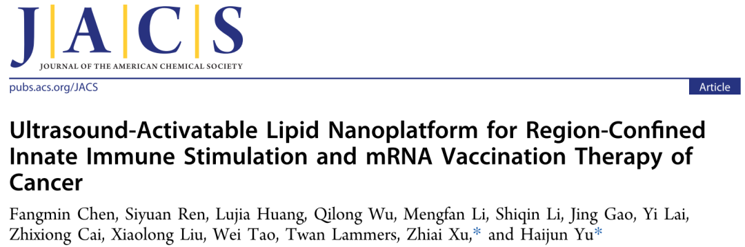 近日,中科院上海药物所于海军教授团队联合华东师范大学徐志爱教授在J Am Chem Soc上研究论文:Ultrasound-Activatable Lipid Nanoplatform for Region-Confined Innate Immune Stimulation and mRNA Vaccination Therapy of Cancer。