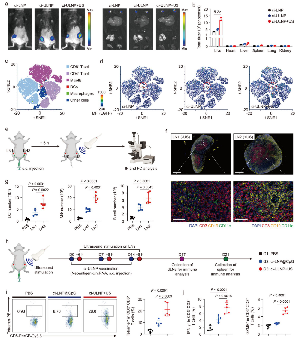 图5 ci-ULNP+US可促进LN特异性circRNA递送和先天免疫,从而在体内诱导新抗原特异性T细胞应答。