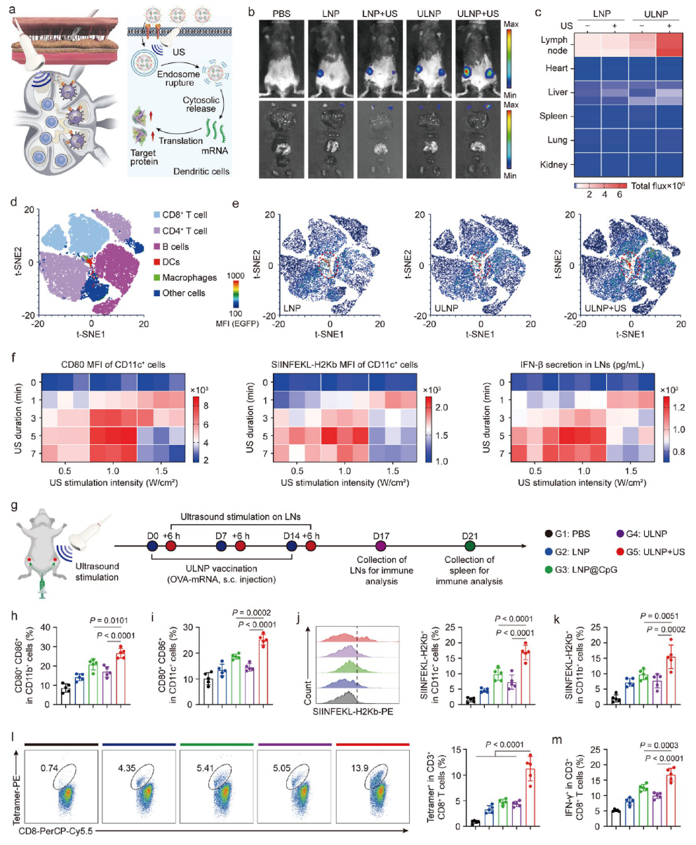 图2 ULNP+US可促进LN特异性mRNA的传递和激活天然免疫,从而在体内诱导强大的T细胞免疫。