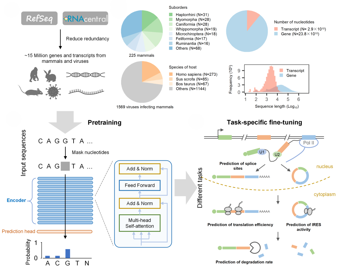 为了突破上述瓶颈,研究团队设计并训练了基于多层transformer编码器架构的RNA语言模型LAMAR。研究首先下载处理约1500万条哺乳动物和病毒的基因和转录本序列,通过掩码学习进行无监督预训练,预先提取RNA的序列特征;之后使用含有标签的数据集微调模型,实现RNA调控高效预测。