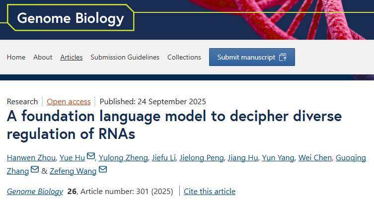 9月24日,国际学术期刊Genome Biology在线发表了中国科学院上海营养与健康研究所生物医学大数据中心张国庆研究员与南方科技大学生命科学学院系统生物学系王泽峰讲席教授团队的合作论文“A foundation language model to decipher diverse regulation of RNAs”。该研究构建了一种基于深度神经网络的预训练模型,可微调预测pre-mRNA的剪接位点、mRNA的翻译效率、mRNA的降解率和内部核糖体进入位点(Internal Ribosome Entry Site,IRES)等多个RNA调控相关的下游任务,揭示了RNA中调控元件的序列特征并鉴定新型翻译调控元件,为理解RNA调控机制和优化RNA的生物医学应用提供了新工具和新思路。