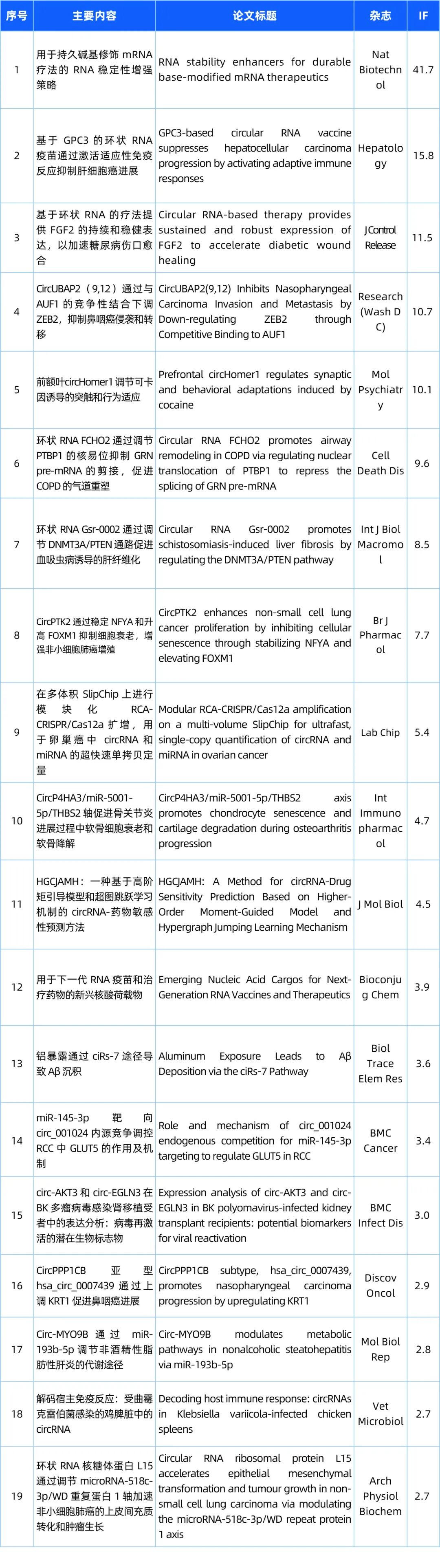 研/究/热/点 欢迎来到“circRNA研究汇总”栏目,本栏目将为您带来circRNA领域的最新研究成果。本期我们精选了19篇最新文献,涵盖了circRNA的基础研究、功能探究以及与疾病的关联。请您紧跟circRNA研究的步伐,共同洞悉科研前沿的最新动态! 检索式:(circRNA[Title/Abstract]) OR (circular RNA[Title/Abstract]) OR (circular mRNA[Title/Abstract]) 研究汇总列表 分类: 最新重要进展, 每周进展汇总, 研究热点跟踪admin十一月 10, 2025评论