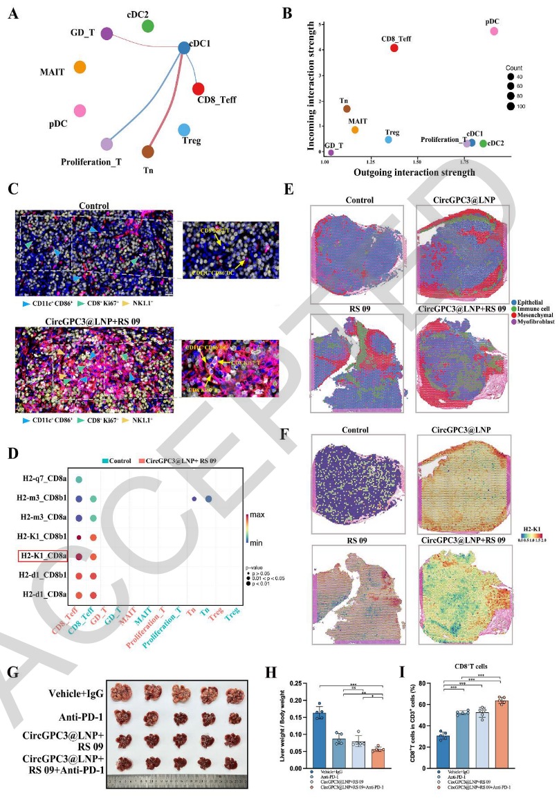 CellChat分析显示联合治疗显著增强cDC1与CD8⁺ T细胞的相互作用,特别是通过MHC-I类分子抗原呈递途径。H2-K1-CD8a配体-受体对在联合组中表达上调,促进T细胞识别与活化。空间转录组学分析也支持抗原呈递与T细胞激活的增强。总之,circGPC3联合TLR4激动剂可显著增强免疫蛋白酶体介导的抗原呈递,通过MHC-I信号通路增强cDC1和CD8+ T细胞之间的相互作用,促进更有效的适应性免疫反应启动和TME重编程。