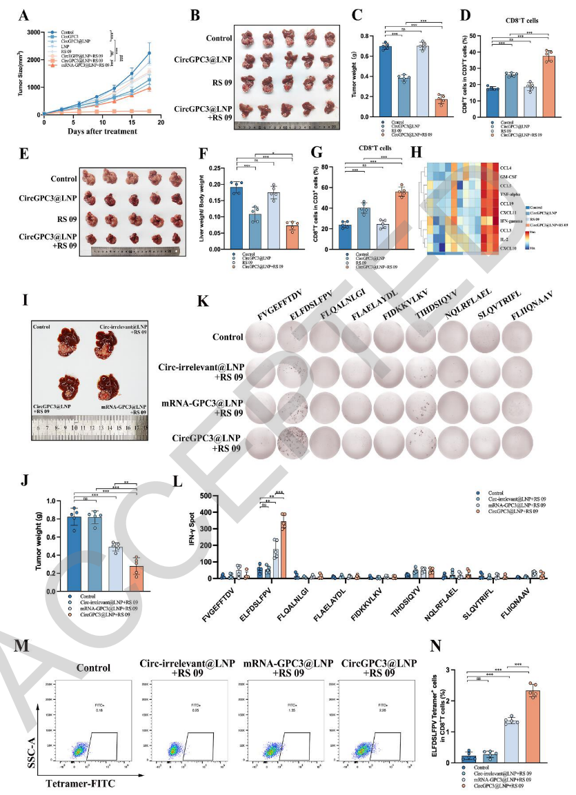 circGPC3和mRNA-GPC3疫苗都显著抑制了肿瘤的生长。然而,circGPC3即使在较低剂量(10μg)下也显示出更强的肿瘤效果(抑制率达77.3%),显著增加了TME内CD8+ T细胞比例;而mRNA-GPC3组肿瘤抑制率为63.6%。总之,circRNA在翻译效率、表达稳定性和肿瘤抑制效果方面均优于线性mRNA。