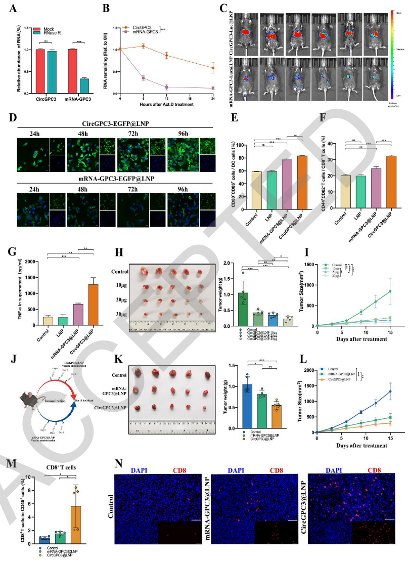 RNA疫苗的效果在很大程度上受到抗原表达的影响。circRNA因其共价环结构,稳定性高于线性mRNA。因此,团队构建了编码GPC3的肝癌疫苗circGPC3。