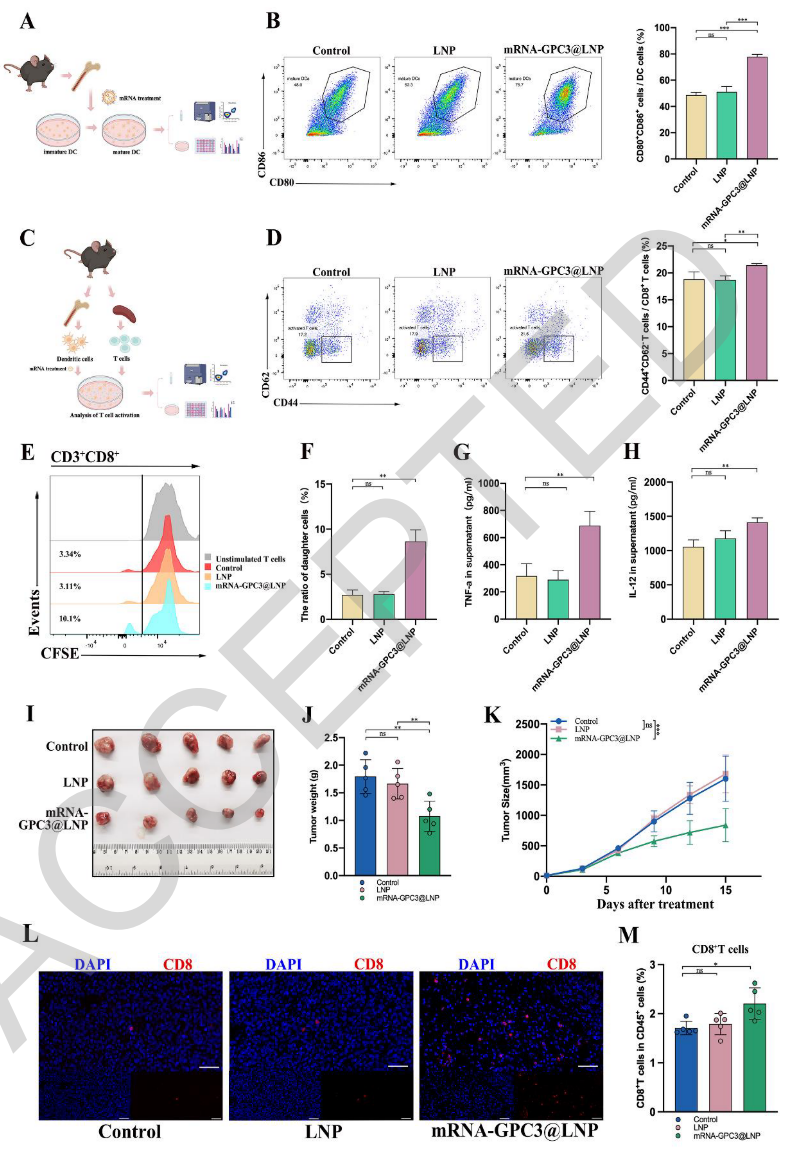 研究针对GPC3抗原,开发了基于SM102的脂质纳米粒(LNP)的mRNA-GPC3疫苗。该疫苗在体外显著促进DC的成熟,相比对照组(48.0%)和LNP组(52.3%),mRNA-GPC3疫苗组CD80+ CD86+ DC比例(75.7%)显著增加,且显著促进IL-12分泌;进一步增强共培养的CD8⁺T细胞的增殖与活化,并提升TNF-α分泌。