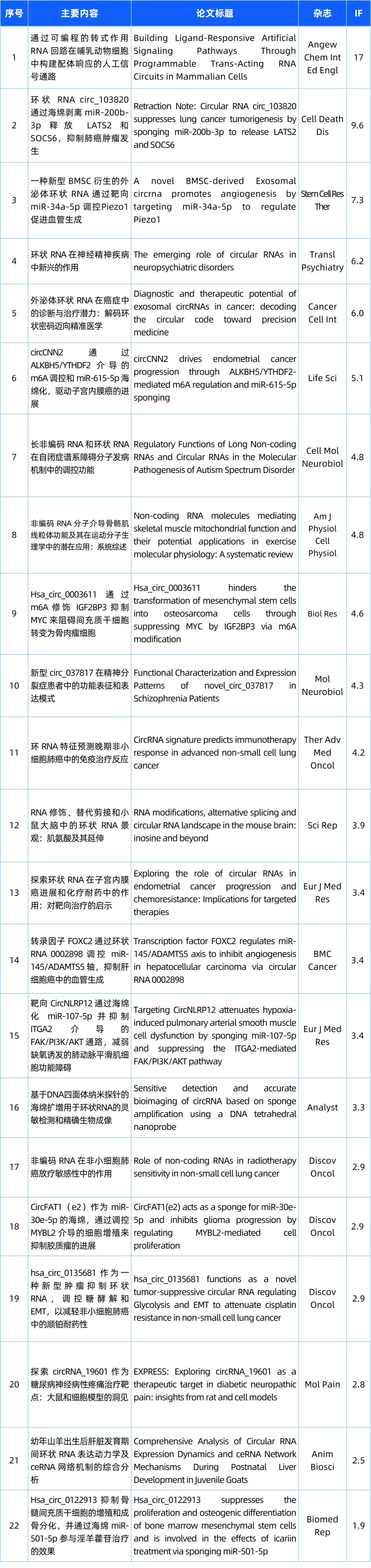 研/究/热/点 欢迎来到“circRNA研究汇总”栏目,本栏目将为您带来circRNA领域的最新研究成果。本期我们精选了22篇最新文献,涵盖了circRNA的基础研究、功能探究以及与疾病的关联。请您紧跟circRNA研究的步伐,共同洞悉科研前沿的最新动态! 检索式:(circRNA[Title/Abstract]) OR (circular RNA[Title/Abstract]) OR (circular mRNA[Title/Abstract]) 研究汇总列表 分类: 最新重要进展, 每周进展汇总admin十二月 1, 2025评论
