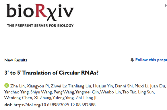 2025年12月9日,来自厦门大学生命科学学院的纪志梁教授团队与福州大学生命科学研究所杨宇丰教授团队在bioRxiv上联合发表了颠覆性研究论文:“3’ to 5’Translation of CircularRNAs?”。