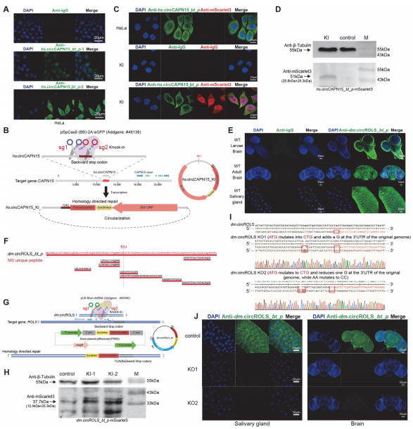 为确证BT在真核生物体内的真实存在,研究团队分别利用人类HeLa细胞和果蝇模型进行了严谨验证。针对人类hs.circCAPN15,研究通过免疫荧光证实其编码的BT蛋白定位于细胞质,并利用CRISPR/Cas9技术构建反向mScarlet3敲入株,成功检测到融合蛋白的特异性表达。在果蝇模型中,研究不仅在脑和唾液腺中检测到dm.circROLS来源的BT蛋白(经免疫沉淀-质谱确认),还通过构建敲入株及特异性突变起始密码子(5’-GUA-3’→5’-GUC-3’)的敲除株,实现了BT蛋白的体内示踪与功能缺失验证。这些结果从内源性水平有力证实了反向翻译机制在真核生物中的真实性。