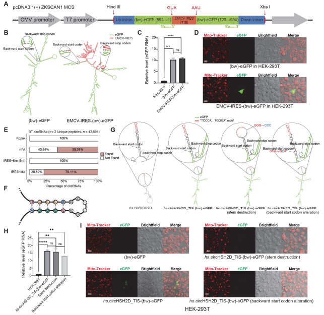 研究利用合成生物学构建了反向eGFP报告系统,成功在细胞内重构了反向翻译过程。机制解析发现,富含“TCCCA…TGGGA”的茎环结构是关键起始元件,破坏该结构或突变起始密码子均可阻断翻译。进一步的无细胞体系验证证实,circRNA 作为模板可以驱动 3’→5’的反向翻译,且依赖特定序列/结构(TIS、茎环)。这一成果不仅验证了反向翻译的物理真实性,也为利用该机制按需定向合成新型蛋白质成为可能。