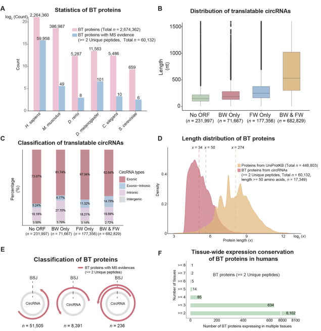 本研究结合大规模计算预测与多组学验证,证实环状RNA介导的BT广泛存在于从酵母到人类的多个物种中。通过Ribo-seq与质谱分析,研究鉴定了60,132个高置信度BT蛋白,其中人类来源高达59958个,几近现有已知人类蛋白质总数的三倍,极大拓展了我们对蛋白质组边界的认知。特征分析显示,BT蛋白多为外显子来源的小分子多肽(20-60个氨基酸居多),呈现显著的组织特异性(86.5%)与进化保守性,表明其受精密调控而非随机产物。这一发现揭示了一个蛋白质组学的“镜像世界”。