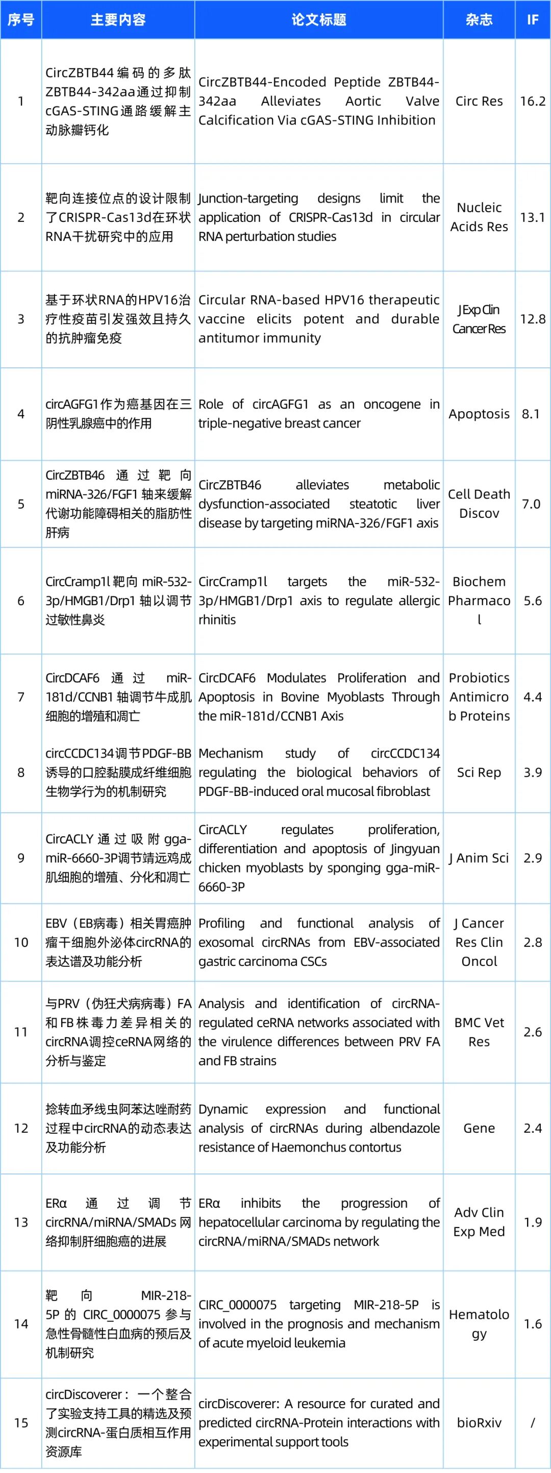 研/究/热/点 欢迎来到“circRNA研究汇总”栏目,本栏目将为您带来circRNA领域的最新研究成果。本期我们精选了15篇最新文献,涵盖了circRNA的基础研究、功能探究以及与疾病的关联。请您紧跟circRNA研究的步伐,共同洞悉科研前沿的最新动态! 检索式:(circRNA[Title/Abstract]) OR (circular RNA[Title/Abstract]) OR (circular mRNA[Title/Abstract]) 研究汇总列表 分类: 最新重要进展, 每周进展汇总admin一月 12, 2026评论