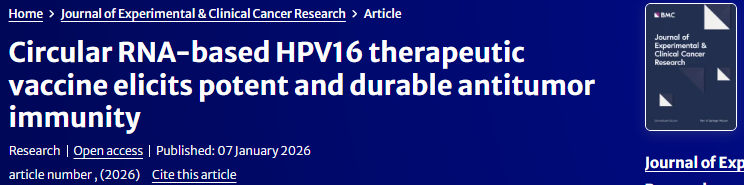 近日,圆因生物(Therorna Inc.)研发团队在国际著名肿瘤学期刊Journal of Experimental & Clinical Cancer Research上发表了题为“Circular RNA-based HPV16 therapeutic vaccine elicits potent and durable antitumor immunity”的研究论文。