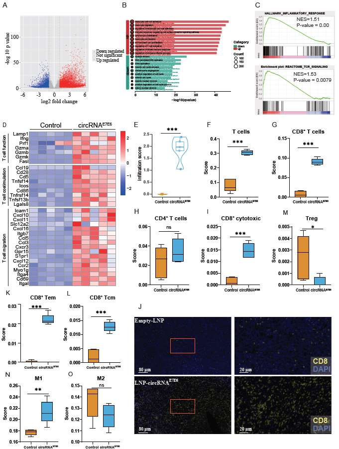 ImmuCellAI-mouse分析结合免疫荧光验证显示,circRNAE7E6进一步提升肿瘤内T细胞浸润,尤其细胞毒性CD8+ T细胞显著增加。肿瘤内效应记忆与中心记忆CD8+ T细胞均升高,而调节性T细胞下降;同时TAM向促炎性M1表型极化增强,M2呈下降趋势。整体提示肿瘤微环境被重构为更具免疫刺激性的状态,从而促进抗肿瘤免疫反应。