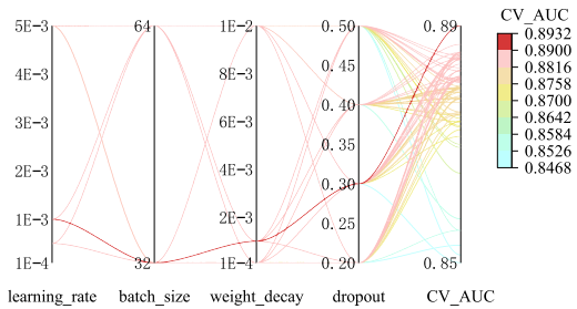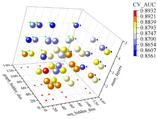 为有效降低网格搜索的计算开销,研究采用了更具针对性的两阶段超参数优化策略。第一阶段优先调整模型架构参数,通过三维散点图确定了序列隐层维度(32)、图隐层维度(64)及图神经网络层数(2层)的较优组合;第二阶段在此基础上,利用平行坐标图对影响模型泛化能力的训练参数进行微调,进一步明确学习率(1e-3)、批次大小(32)、权重衰减及Dropout率的合适配置。